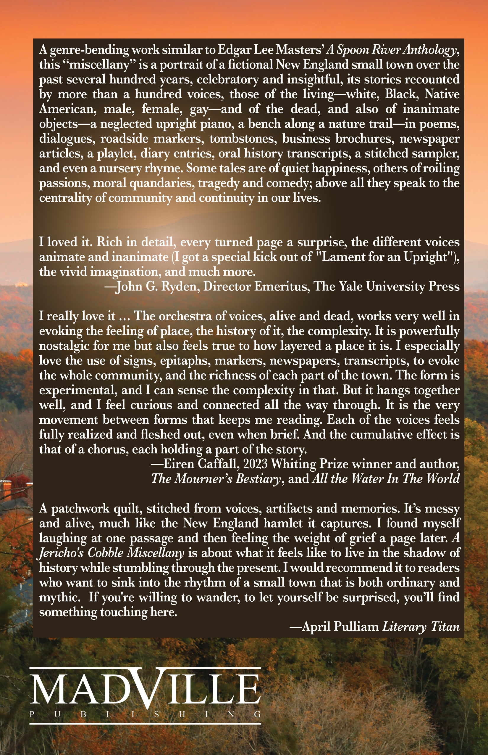 I really love it … The orchestra of voices, alive and dead, works very well in evoking the feeling of place, the history of it, the complexity. It is powerfully nostalgic for me but also feels true to how layered a place it is. I especially love the use of signs, epitaphs, markers, newspapers, transcripts, to evoke the whole community, and the richness of each part of the town. The form is experimental, and I can sense the complexity in that. But it hangs together well, and I feel curious and connected all the way through. It is the very movement between forms that keeps me reading. Each of the voices feels fully realized and fleshed out, even when brief. And the cumulative effect is that of a chorus, each holding a part of the story.—Eiren Caffall, 2023 Whiting Prize winner and author, The Mourner’s Bestiary, and All the Water In The World.